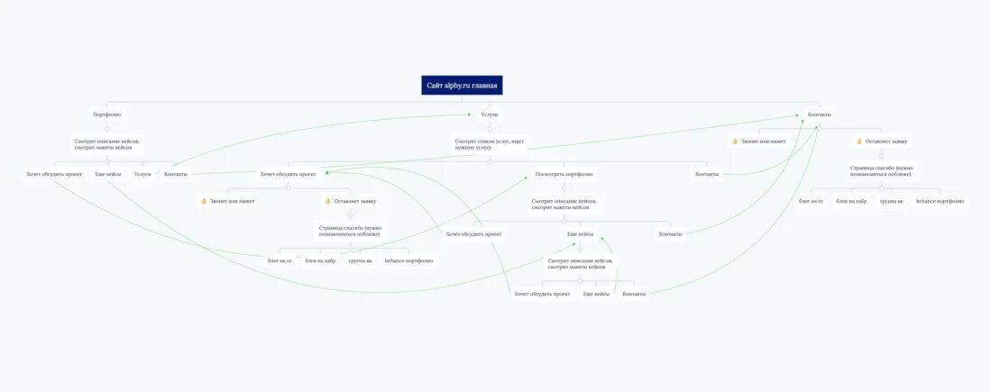 3. далее ему интересно либо перейти в контакты, либо посмотреть услуги, либо посмотреть еще кейсы