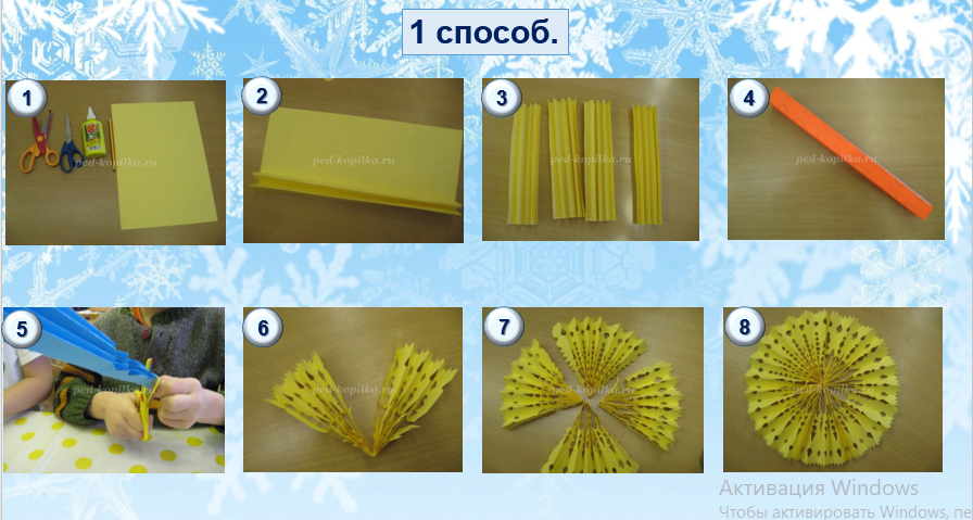 «Как сделать снежинки своими руками» Новогодние праздники – это самые любимые праздники в году и для детей, и для их родителей. В преддверии новогодних праздников каждому хочется, что бы дом был необычайно красивым, уютным и сказочным. Очень важно постараться создать вокруг ребенка атмосферу волшебства и чуда! Вырезание снежинок из бумаги – увлекательное и любимое занятие детей, появившееся лет 150 назад. В советское время ювелирное владение ножницами позволяло сделать оригинальные украшения и существенно сэкономить на елочных украшениях. Дети же получали огромное удовольствие от того, что могли участвовать в подготовке к празднику, сделать что-то своими руками, в классах могли даже устраивать конкурсы на лучшую снежинку. А с точки зрения воспитания – вырезание бумажных снежинок способствует развитию пространственного и объемного мышления, фантазии, мелкой моторики, что очень полезно для детей. 1 способ. Материалы и инструменты: Лист бумаги А4 разрезаем пополам. Всего нам понадобится 4