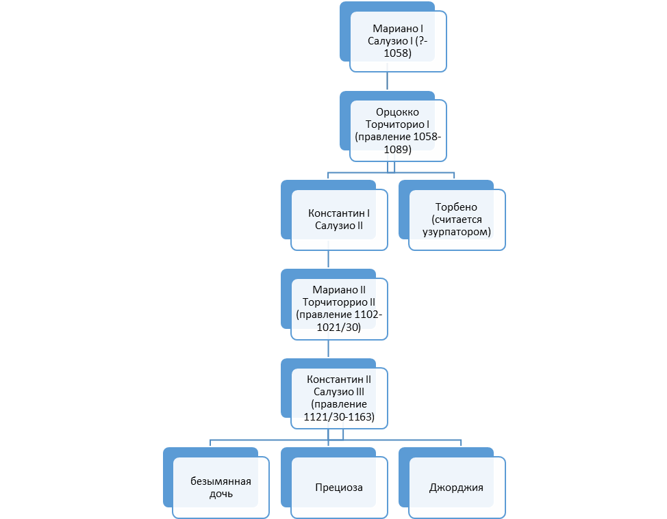 Первым известным юдексом Кальяри считается Мариано Салузио I, но личность это полулегендарная. Орцокко Торчиторио, следующего юдекса, о ком уже есть документальные свидетельства, принято считать его сыном, но это опять же, не точно.