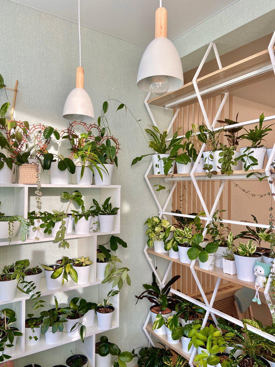 Невысокий стеллаж у стены подойдёт лишь для «деток» или ампельных растений, так как высота полок здесь всего 25 см. Но хойи, которых у меня много, вполне себе там помещаются. Хотя когда они подрастут, придётся, наверное, что то новое придумать)