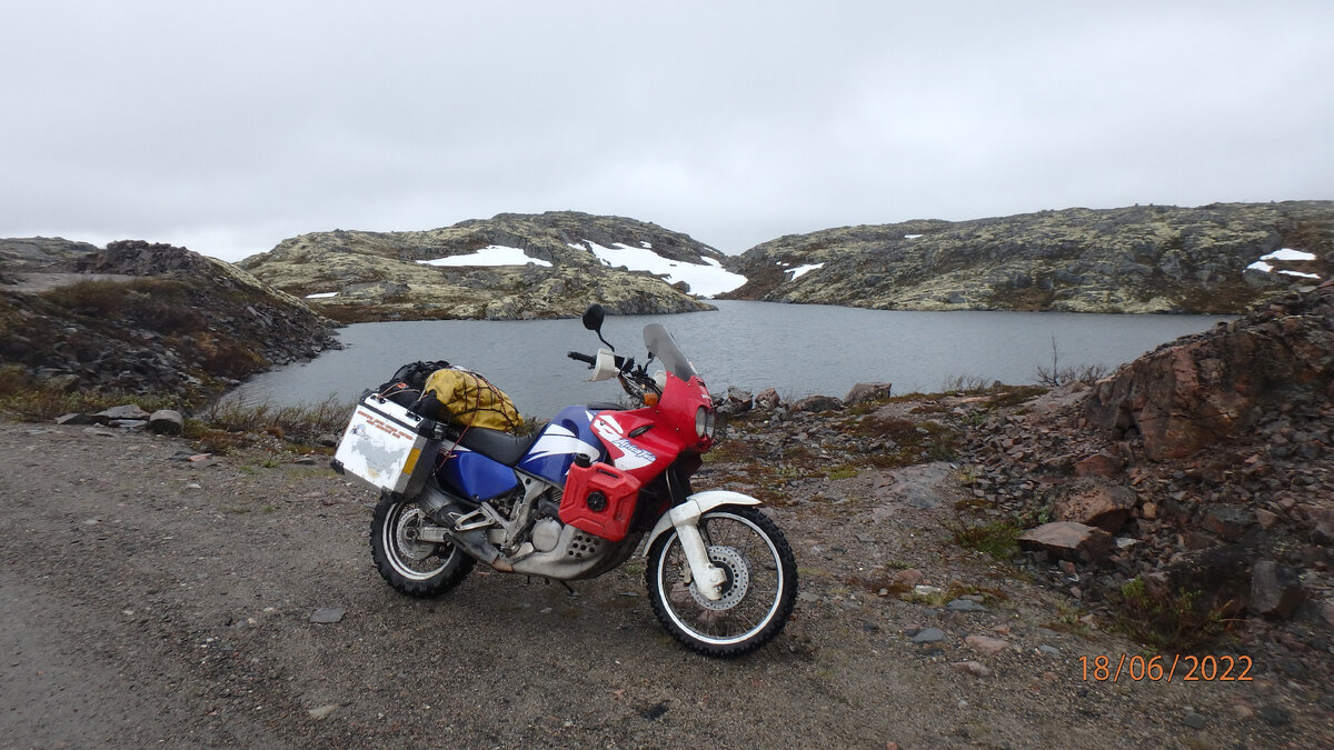 В одном месте была довольно крутая полка на подъем, с рыхлым грунтом и крупными камнями. Штурмуя ее, почти на самом выезде, я передним колесом наскочил на камень и потеряв равновесие завалился набок. Попытка тронуться на склоне не увенчалась успехом, так как мотоцикл сразу зарывался в грунт задним колесом. Пришлось спускаться задом по склону вниз на более пологое и более твердое место. Заново стартанув, я проехал чуть дальше места падения и вновь завалился.. Решил разгрузить мотоцикл и подняться на пустом до полки, а потом вернуться за вещами. Спустившись вниз и разогнавшись-выехал этот подъем и на пологом месте остановился, чтобы забрать вещи. Погода начала меняться: пошел дождь со снегом, температура ощутимо упала. Пока ходил и привязывал багаж- успел вымокнуть. Вообщем поехал дальше. Дорога в основном каменистая, но есть и земляные участки, которые раскисли от дождя и стали скользкими. На одном таком участке, при подъеме в гору, в очередной раз и брякнулся. Развернув лежащий мотоцикл передним колесом вниз стал поднимать, а он у меня покатился вниз( видимо когда разворачивал на боку лапка передач перещелкнулась в нейтраль), спасло то, что мотоцикл уткнулся колесом в бруствер и упал на бок, а так бы мог улететь достаточно далеко и как его оттуда доставать, было не понятно. Дождь со снегом так и шел. Проехав еще немного поднялся на перевал Шаукам.