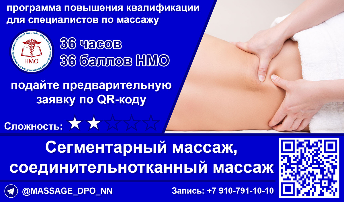 Нижегородский медицинский колледж приглашает специалистов по массажу пройти обучение по программе повышения квалификации и освоить техники и методики сегментарного и соединительнотканного массажа.