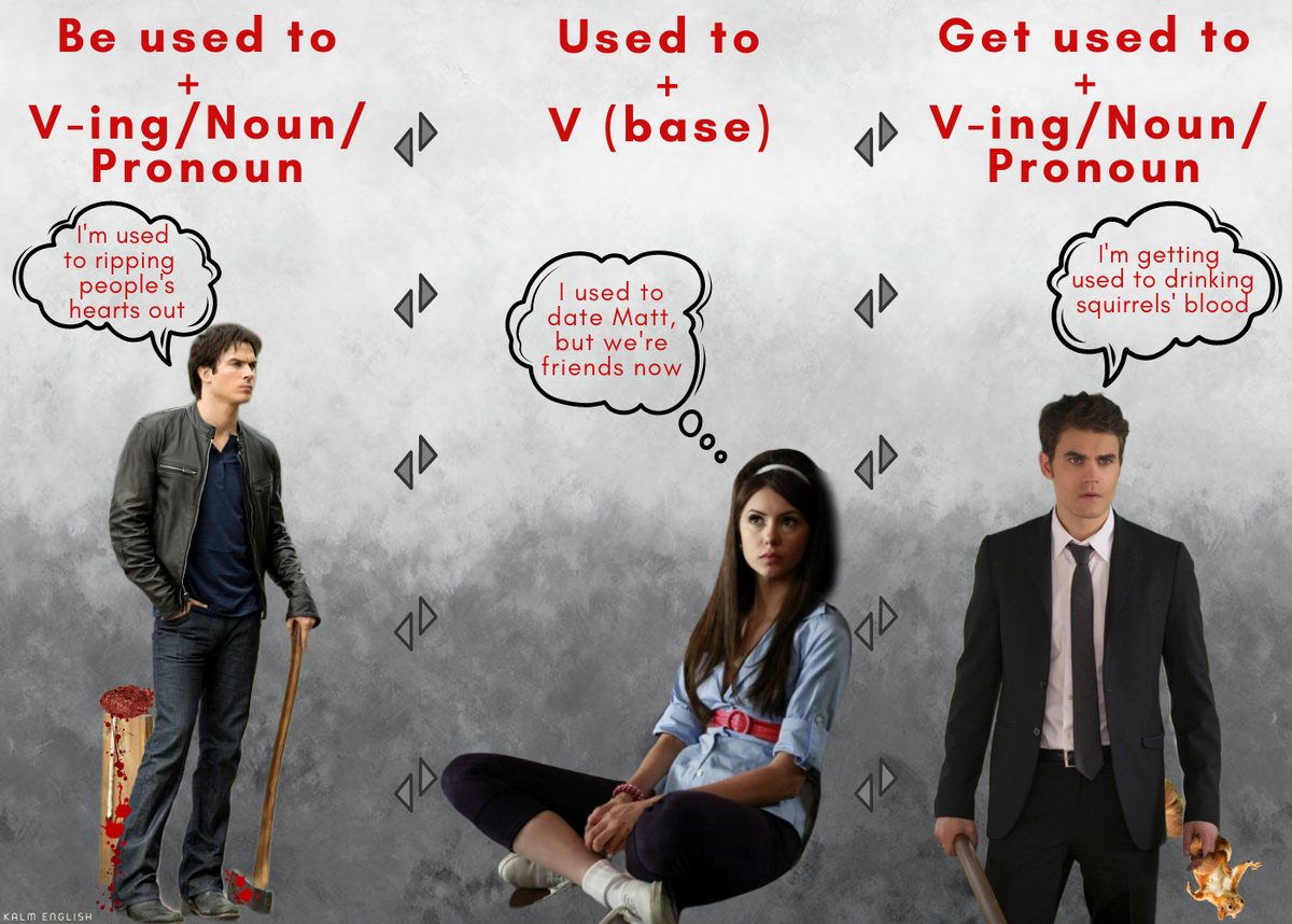 Сколько песен посвящено “USED TO” – и пальцев на руке не хватит сосчитать. А заслуженно или нет, решай on your own. Тема серьёзная, так что глазки пошире, мозг поактивнее, и вперёд резвиться. Итак, первый любимец публики – “BE USED TO + V-ING/NOUN/PRONOUN”. Если твоя жизнь – одна сплошная привычка, и для тебя не в новинку то, чем ты занимаешься, то “BE USED TO + V-ING/NOUN/PRONOUN” с удовольствием выступит на твоем корпоративе жизни – хоть в настоящем, хоть в прошлом, хоть в будущем. Правда, состав участников иногда может различаться. С “BE USED TO” сотрудничает и глагол, и существительное, и местоимение. ✔️ He is used to killing. Он привык убивать. ✔️ He was used to blood. Он привык к крови. ✔️ He will be used to it. Он привыкнет к этому. Следующий кумир многих поколений – “USED TO + V (BASE)”. Он неприхотлив в общении, но только если все привычки остались в прошлом, да и действия, которые крутились на повторе, сейчас уже неактуальны. Причем, одной единственной формулы перевода “USED