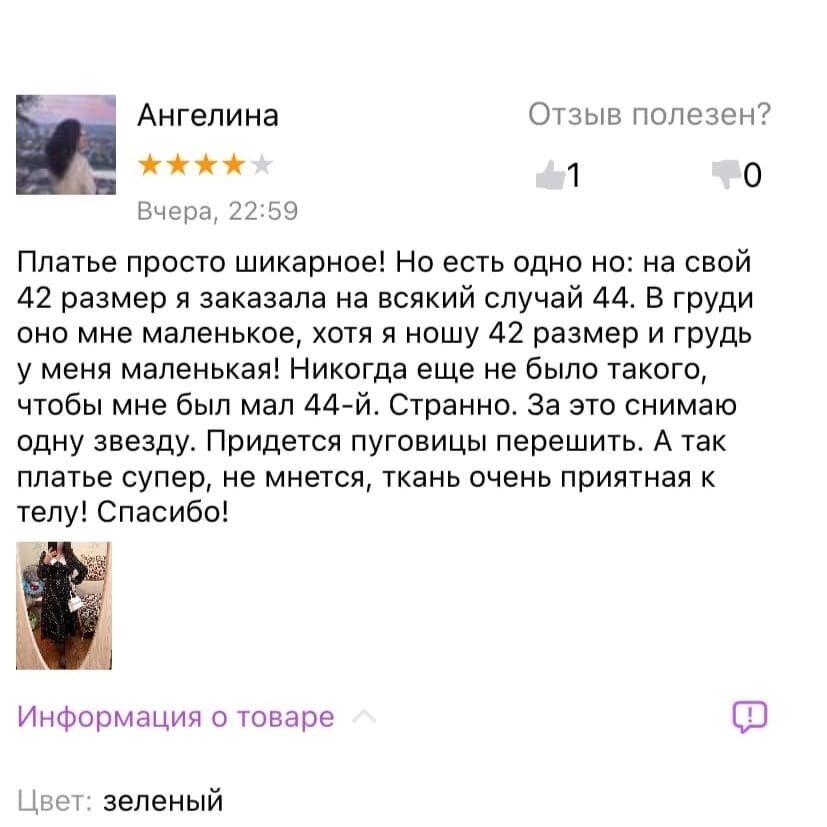 Вот я искренне не понимаю, почему на Wildberries, некоторые люди снижают рейтинг за то, что переоценивают свой реальный размер. Попался мне тут такой отзыв на платье: Все бы ничего, но сама девушка на фото явно не 42 размера. Видно, что она в теле и тут максимум 44-46 размер. Судя по запястьям. полным икрам и 3д животику, не очень-то похоже на 42. Хотя может лет 10 назад у нее xs был и она по старой памяти заказывает. Причем в профиле этой дамы, можно посмотреть ее параметры фигуры. Рост 160, вес 60. Ну да, нуда, конечно же это размер XS. У меня самой размер xs, но я почти на 15 кг легче этой барышни. Какой же разный у нас xs... Причем судя по ее отзывам ве профиле, у нее далеко не впервые такая проблема. Просто она расстроилась и не была готова к тому что пополнела. По моему, кто-то давно не вставал на весы и пора пересмотреть свой размер. Наверное, некоторые не хотят принимать реальность. Видимо, так жить легче. Мне девочка под в 100 кило, в группе худеющих доказывала, что она носит