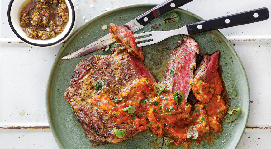 🎄🎅 Если вы собрались произвести впечатление на свою семью или небольшую компанию, то вам как раз подойдет этот рецепт нежного, сочного стейка. Подготовиться стоит на этапе выбора мяса, это всегда верхняя часть туши: в говядине – толстый край, тонкий край и вырезка. Также стоит помнить пару правил. Примерно за час до приготовления достаньте стейк из холодильника: если готовить стейк холодным, жар будет хуже проникать внутрь мяса. И обязательно убедитесь, что ваша решетка гриля очень горяча: только так вы получите аппетитную корочку. Те же правила нужно соблюдать, если вы решили приготовить стейк на гриль-сковороде. И последнее: наш соус просто чудесный! Проверено. ИНГРЕДИЕНТЫ: 4 стейка из говядины 70 г сливочного масла 2 зубчика чеснока 1 ст. л. горчицы соль копченая паприка Для соуса: 3 сладких перца разного цвета 2 головки чеснока 1 маленькая луковица 5–6 ст. л. оливкового масла 2 ст. л. каперсов 3–4 веточки петрушки соль свежемолотый черный перец Время подготовки - 1 ч