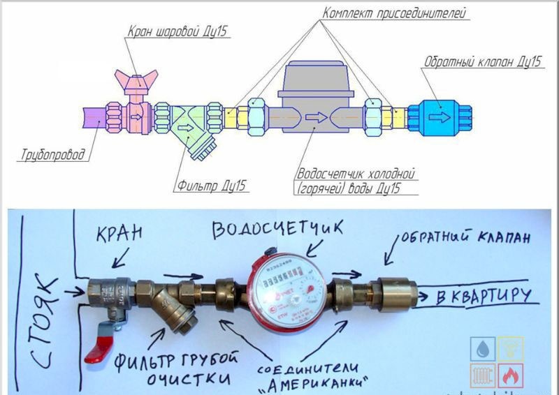 Детали для водомерного блока раскладываются в одну линию: отсекающий кран, очистной фильтр, счетчик учета воды, обратный клапан. На корпусе деталей есть стрелка – указатель направления водного напора. Все они должны указывать в одном направлении от запорного крана к внутрикомнатной разводке.