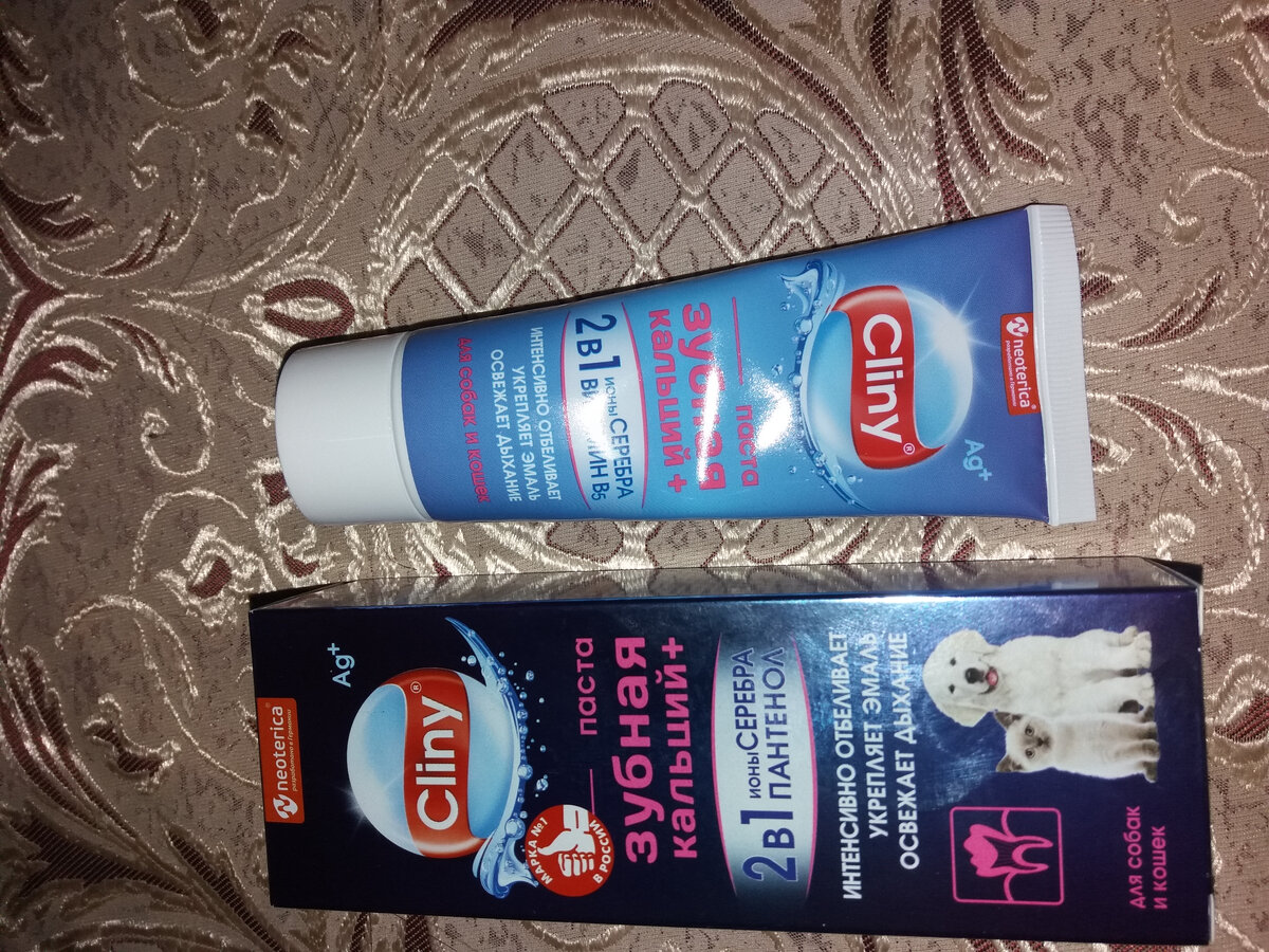 Пока суть да дело - купила Барсику зубную пасту специально для кошек и собак. Перерыла весь интернет. Почитала отзывы. Остановилась на зубной пасте, разработанной в Германии. Устроила и цена и отзывы. Сходила в вет.аптеку "Айболит", узнала стоимость зубной пасты у них, сравнила с ценой в интернете, там и купила. Зубные щетки брать не стала-какие-то они огромные для моего маленького Барсика))) читала в интернете, что можно бинт на пальчик намотать и так почистить. Решила что это будет более щадящий метод. Пришла домой. Барсик с Домовым встретили, помогли распаковать и разложить продукты по местам (мясо, яйцо, хлеб, вафли). Домовой рассмотрел тюбик зубной пасты со всех сторон и... решил вначале распробовать на себе -вдруг не понравится, тогда котику точно не подойдет. Это так Домовой сказал, а я думаю, что ему просто тюбик понравился))). После дегустации и утверждения пасты Домовым уговорили Барсика почистить зубки... Домовой ему рассказал, что ничего страшного в этом нет и вообще