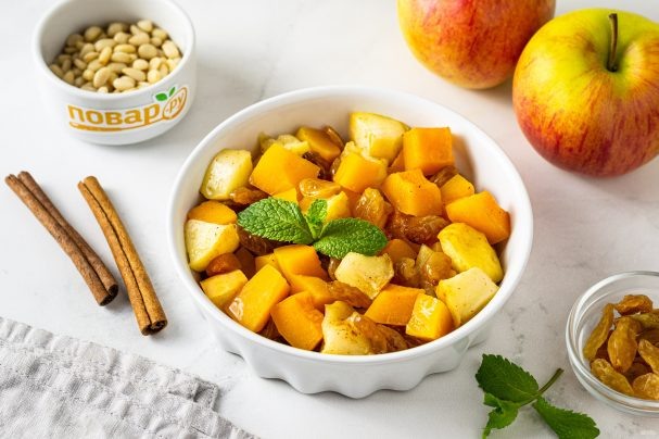 Сегодня я решила поделиться с Вами очень вкусными и полезными рецептами. Они подойдут, как для крохи, так и для взрослых людей. 1. Запечённая тыква с яблоками и медом Нам понадобится для 6 порций: - Тыква – 500 гр. - Яблоки – 2 шт. - Мед – 200 гр. - Вода - 0,5 стакана - Корица (по желанию) – 1 гр. - Сливочное масло – 10 гр. Начинаем готовить: 1. Берем тыкву, моем ее, чистим и удаляем семена. Мякоть нарезаем небольшими кубиками. 2. Смазываем форму сливочным маслом, выкладываем нарезанную кусочками тыкву. Яблоки моем, чистим от кожуры, удаляем сердцевину с косточками. Нарезаем кубиками, как и тыкву, но покрупнее, так как яблоки запекаются быстрее. 3.Яблоки, нарезанные кубиком выкладываем в форму к тыкве. Поливаем сверху половиной приготовленного меда. Можно использовать засахаренный мед, он растает при приготовлении блюда и пропитает яблоки и тыкву. 4. Посыпаем наше блюдо молотой корицей. Наливаем в форму небольшое количество воды, чтобы овощи и фрукты не подгорели и быстрее готов