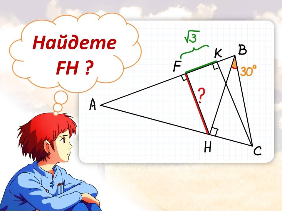 Не так давно публиковал задачку. на которую было мало откликов. Возможно, она оказалась неинтересна... Но, скорее всего, оказалось просто слегка сложноватой. Вот она и ее чертеж: Итак, нам дан треугольник АВС. Из вершин В и С проведены перпендикуляры ВН и СК соответственно. Угол НВС равен 30 градусам. Из точки Н проведен перпендикуляр НF к стороне АВ. Отрезок FK равен корню из трех. Требуется найти FH. Кажется, что этот перпендикуляр FН какой-то странный, не привязан к вершинам, углы в трапеции FKCH неизвестны... Решать ее без дополнительных построений будет трудновато. Поэтому дополним рисунок. Чаще всего задание становится удобнее, если находить неизвестные величины из треугольников, особенно прямоугольных. Можно, поэтому, либо провести FC, либо FH. Достроим отрезок FH, он, вероятно, будет более полезным, ибо включает в себя и известную сторону, и неизвестную! Вроде бы, нам здесь опять ничего не известно дополнительного. Но это не совсем так! Давайте посмотрим на прямоугольные тр