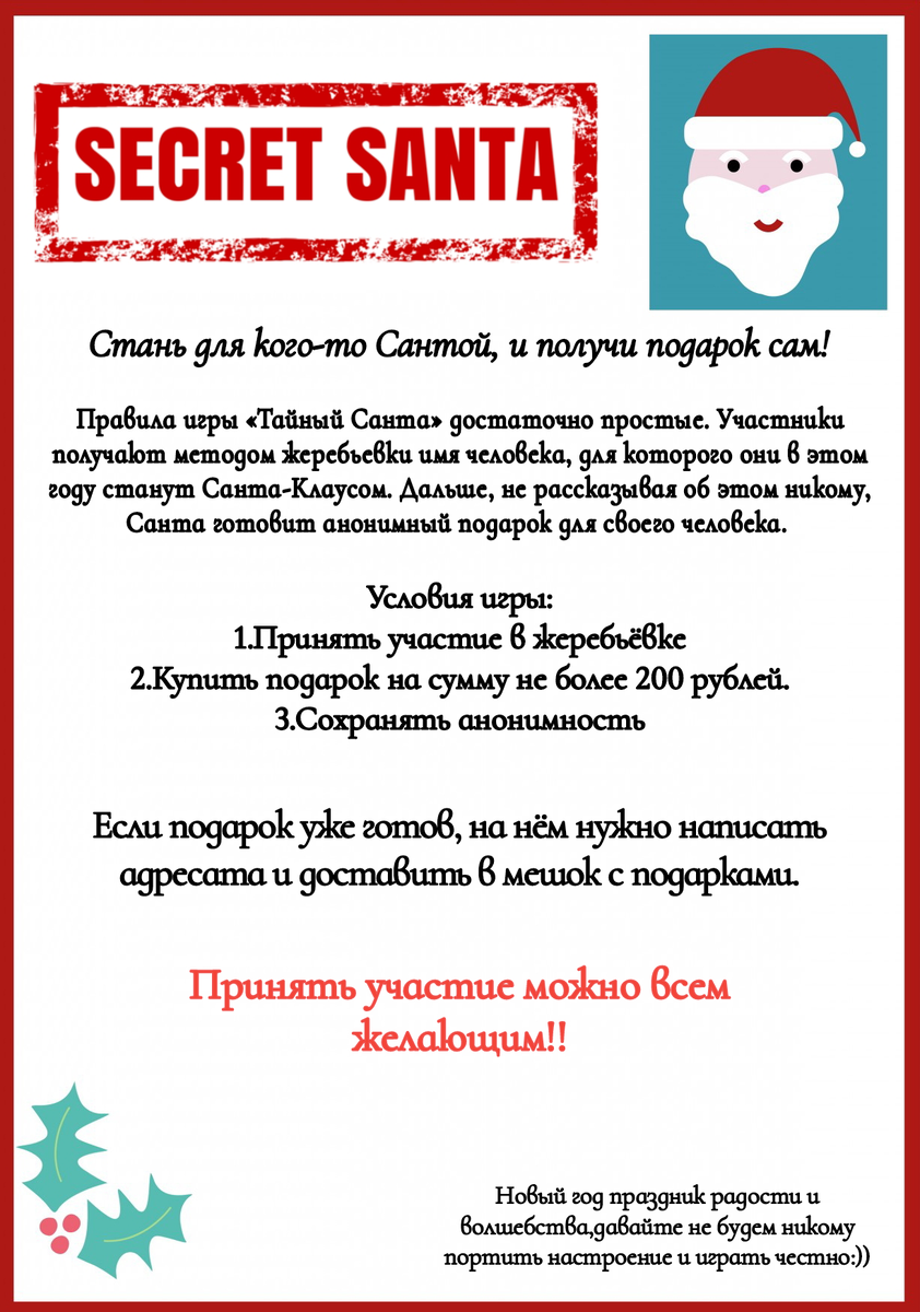 Тайный Санта - лучшая новогодняя игра, создающая атмосферу праздника и волшебства! Более 150 стран по всему миру играют в Санту, и каждый год все с трепетом ждут этот момент! Суть игры заключается в анонимном обмене подарками.Никто не знает, кто кому дарит подарок,но все получают подарок от всего "Санты". Больший спрос на эту игру присутствует в Российских школах,между одноклассниками.И сейчас я вам расскажу, как мы в организовали игру в школьных условиях. Примерно в конце ноября у нас появилась афиша в классе,где было немного информации что это такое и как играть. Наш класс разделили по три группы,для облегчения задачи(потому что если б хулигану класса выпала отличница,вопросов было бы много, думаю, вы понимаете о чем я).Группы были разделены так,чтобы все друг другу примерно знали что дарить. Жеребьёвка. Здесь уже идёт сложней.У нас было 3 коробки,на которых были подписаны фамилии, кому кидать в nную коробку бумажки. Бумажка по наполнению информации должна выглядеть примерно т
