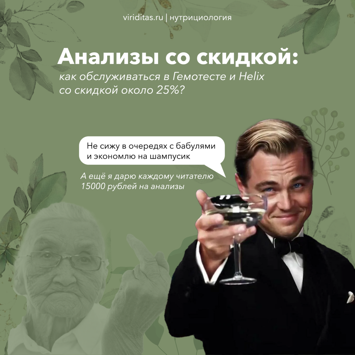 И тут мне написал очередной представитель, предлагая скидку 20-25% для клиентов на анализы в лабораториях Гемотеста и Helix. Ну и мне кэшбек, конечно же. Я искренне не понимала, в чём выгода лабораториям суммарно отдавать половину стоимости на скидки да бонусы, и делать анализ за копейки.