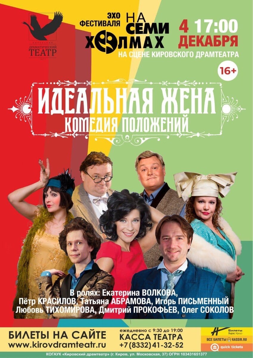 4 декабря (воскресенье), 17:00 - «ИДЕАЛЬНАЯ ЖЕНА», комедия. В главных ролях: Екатерина Волкова, Пётр Красилов, Татьяна Абрамова, Игорь Письменный, Любовь Тихомирова, Дмитрий Прокофьев и Андрей Соколов.