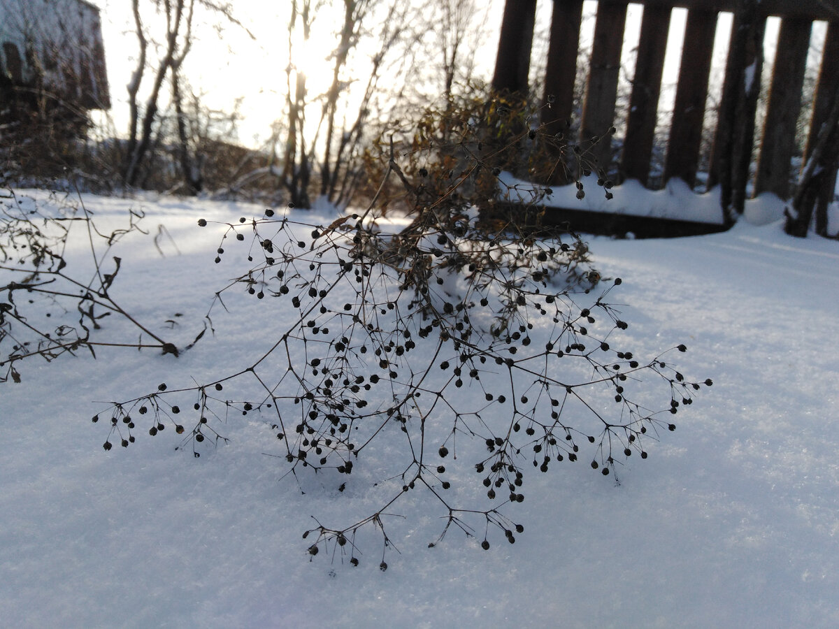 А у забора за домиком покачивает черными головками рудбекия рассеченная. Крыши, перекладины забора и терраса под снегом.