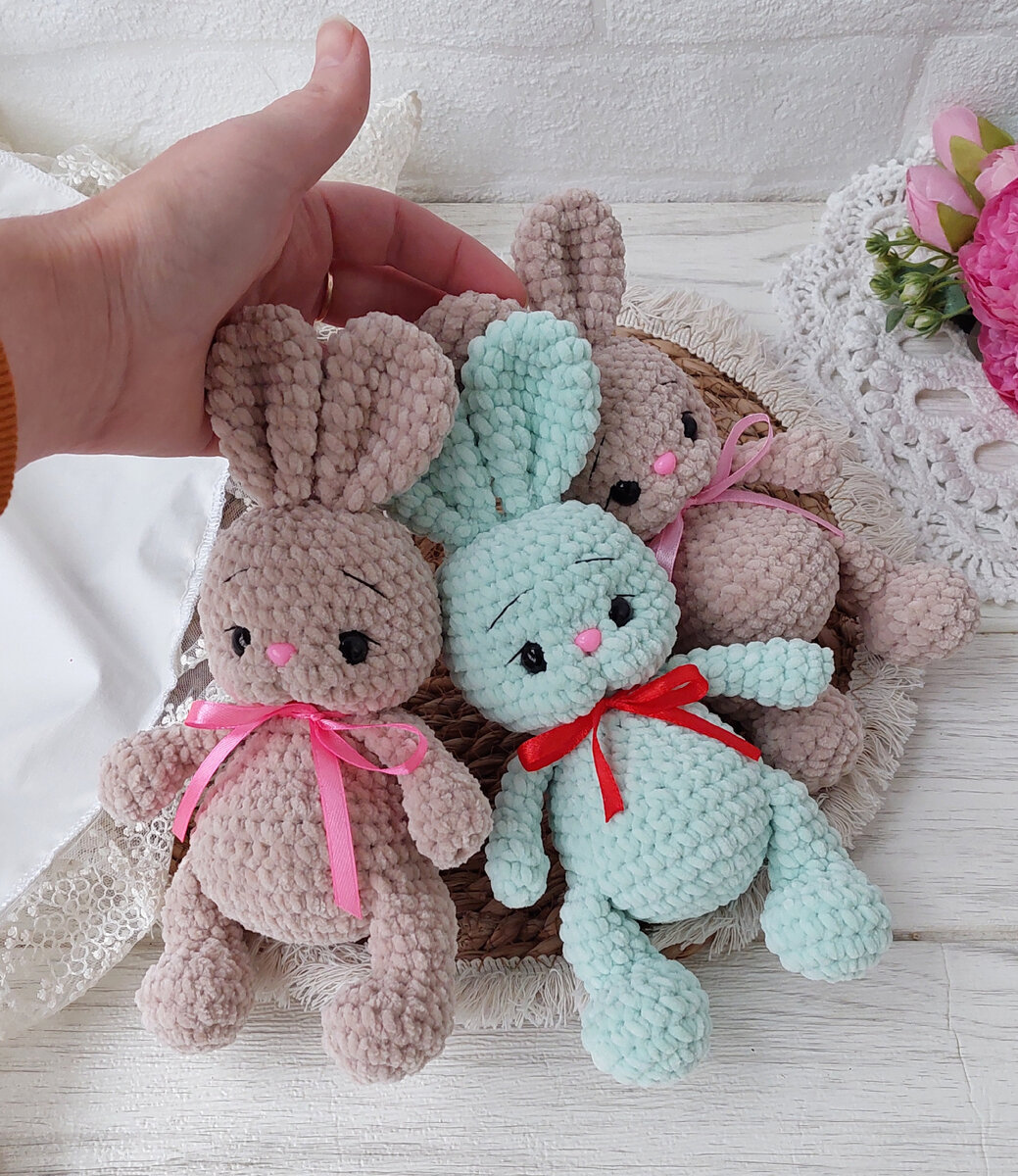 По данному мастер-классу Вы сможете связать зайчика из плюшевой пряжи, я вязала из Дольче беби. Так же по этому же описанию связаны мини зайчики из Ириса И зайчик из Himalaya Koala так же по данному описанию. Единственное, добавлен ряд прибавок в ушках и пара рядов с убавками Стоимость МК 150 руб. Для покупки можно написать Вконтакте https://vk.com/fairyforkids
