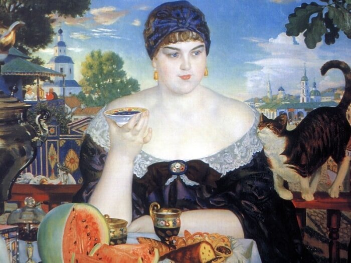 Знаменитый русский художник Борис Кустодиев в своем творчестве часто обращался к образам купчих, самой известной среди этих работ является «Купчиха за чаем». С картиной связано немало любопытных фактов: на самом деле художнику позировала совсем не купчиха, к тому же написанное в 1918 г. полотно до сих пор вызывает множество споров: относился ли Кустодиев к своей модели с иронией или искренне ею восхищался?