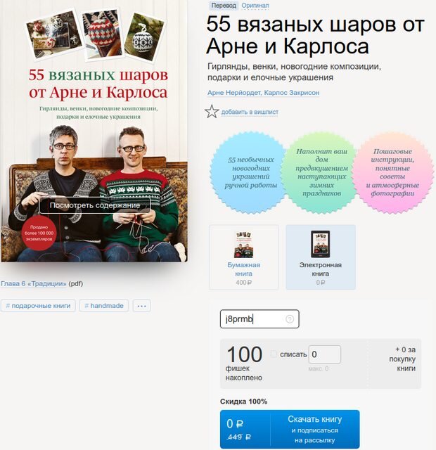 Издательство «Манн, Иванов и Фербер» бесплатно раздаёт электронную книгу Арне Нерйордет, Карлос Закрисон «55 вязаных шаров от Арне и Карлоса. Гирлянды, венки, новогодние композиции, подарки и елочные украшения.» в формате pdf. Промокод: j8prmb
