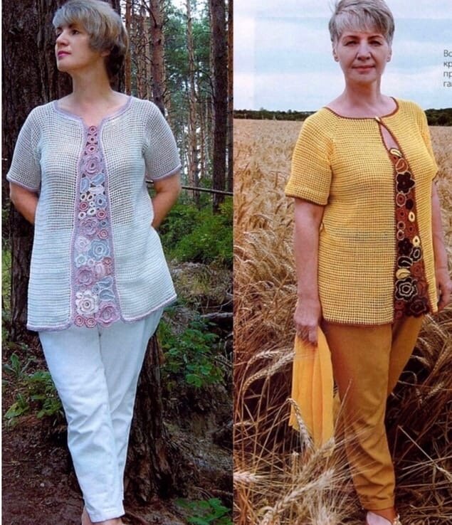 Приветствую вас, дорогие друзья! Давненько я не выкладывала модели размером Plus. Исправляюсь. Сегодня для вас замечательная туника с цветочными элементами. Дизайн Риты Кожан. Потребуется 350 гр белой/желтой пряжи "Анна-16" (100% мерсеризованный хлопок, 530м/100гр). Остатки светло-розового, розового, персикового, голубого/ коричневого, терракотового, темно-коричневого цвета для отделки. Крючок № 1,5, №2. Листайте галерею. Туника состоит из двух одинаковых, отдельно связанных деталей. Левая и правая деталь туники связаны филейной сеткой: *1 ст. с/н, 1 возд. п.*, повторять от*до* до конца ряда. Наберите начальную цепочку из 1255 возд. п. Распределите петли следующим образом : 3 возд. п. подъёма, 40 возд. п. - 1/2 переда, 1 возд. п. - линия реглана, 40 возд. п. - рукав, 1 возд. п.- линия реглана,, 40 возд. п. -1/2 спинки. Вяжите, в каждом ряду выполняя прибавления реглана, провязывая 2 ст. с/н, 3 возд. п. и 2 ст. с/н (см. схему 1). Вяжите, расширяя полотно, 27 рядов до проймы. В 28-м ряд
