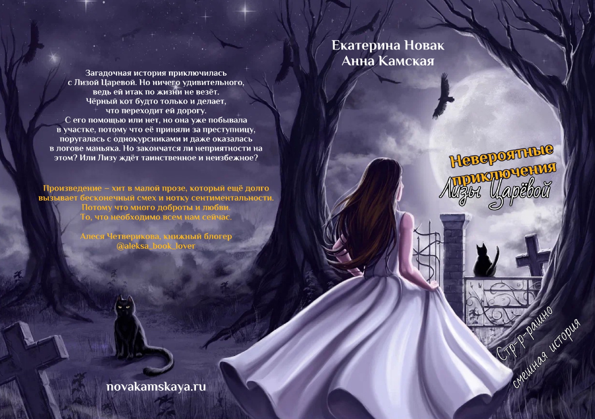 Отзыв «Невероятные приключения Лизы Царёвой» Екатерина Новак и Анна Камская Аннотация: Загадочная история приключилась с Лизой Царёвой. Но, ничего удивительного, ведь ей итак по жизни не везёт. Чёрный кот будто только и делает, что переходит ей дорогу. С его помощью или нет, но она уже побывала в участке, потому что её приняли за преступницу, поругалась с однокурсниками и даже оказалась в логове маньяка. Но закончатся ли неприятности на этом? Или Лизу ждёт таинственное и неизбежное? Я так много ещё не смеялась при чтении книг! 😃 Юмор у писательниц отличный. 💜 «Меня окружила толпа студентов, и все поздравляли c воскрешением. Я даже представить раньше не могла, что столько народу может быть радо мне. Пожалуй, ради такого даже стоило разок умереть. А самое главное и удивительное, что я сама была очень рада видеть их. Оказалось, что я даже многих знаю по именам, благодаря Настёне, конечно.» Это история лёгкая и одновременно интригующая, с нотками мистики. Описывается жизнь