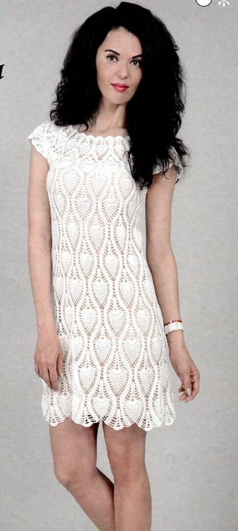 Приветствую вас, дорогие рукодельницы. Существует такое поверье, если встретить Новый Год в чем-то новом, то год будет удачным. Да и не только в приметах дело, всегда хочется за праздничный стол сесть в обновке. А у нас как раз есть время чтобы связать себе наряд на этот замечательный праздник. Предлагаю рассмотреть 3 платья, которые подойдут для праздничного мероприятия. Платье № 1 "Ананасы". Потребуется: 600 гр пряжи (100% хлопок, 210м/50г). Крючок № 2. Основной узор: вязать по схеме 1. На схеме указаны круговые ряды. В высоту выполнить все ряды. На схеме указано прибавление петель. Внимательно следите за нумерацией рядов на схеме. Отделка: вязать по схеме 2. Описание работы: набрать цепочку из 380 возд. п., замкнуть в кольцо, вывязать 3 возд. п. для подъёма на новый ряд, распределить 20 раппортов узора и вязать круговыми рядами по схеме 1. На высоте 18 см от наборного края разделить полотно на 4 части (спинка и перед - по 6 раппортов узора, 2 рукава - по 4 раппорта узора). Затем