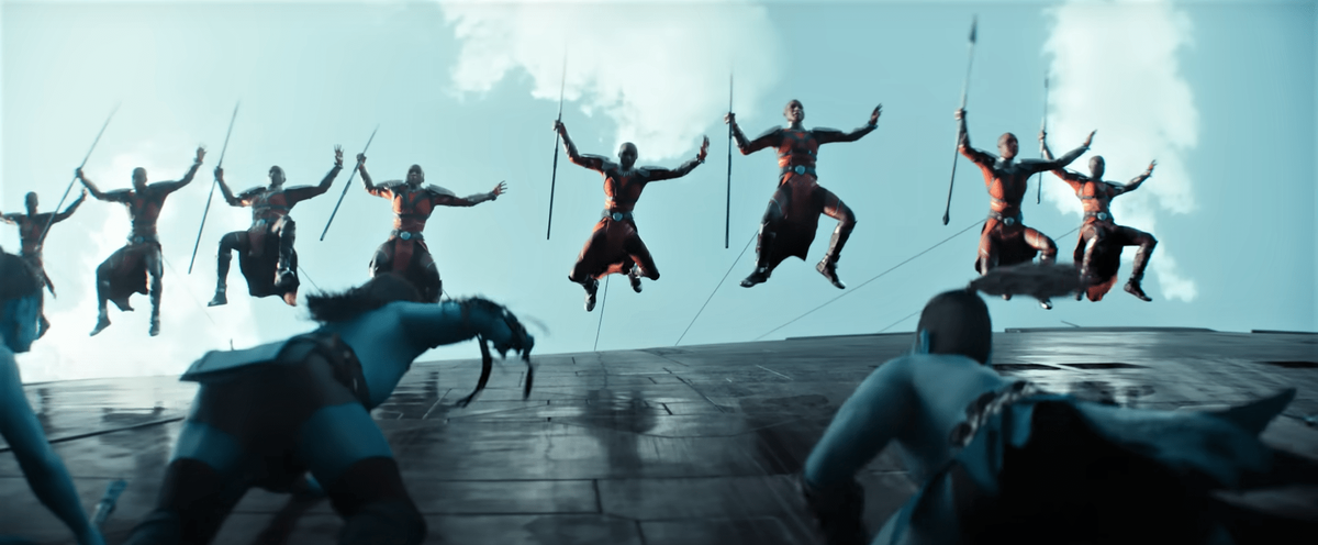 И вот настает час решающей битвы. И ка же наши герои собираются одолеть войско, которое сильнее всего в воде? Правильно, напасть на них посреди океана... Мне вообще нужно объяснять, почему это плохая идея? И пальма первенства тупости переходит от Немора к Шури. Дальше идет довольно лажовая битва. Кстати, когда нам наконец впервые показывают жителей подводного мира при нормальном освещении, начинаешь замечать, как они похожи на Нави из Аватра. И вот наша героиня уже готова добить врага, но тут ей приходят флешбеки о том, что они не так уж и различаются, и вместо того, чтобы прибить тварь она говорит: "Я добрая, а быть доброй это ништяк, будь и ты добрым со мной". И все расходятся мирно. Шури высаживает новые цветы без корней. Немор строит хитрые планы, а у Тчалы есть сын (вот это поворот). О, и Фримена освобождают. Кстати, объясните кто-нибудь, на кой черт он вообще был в этом фильме?