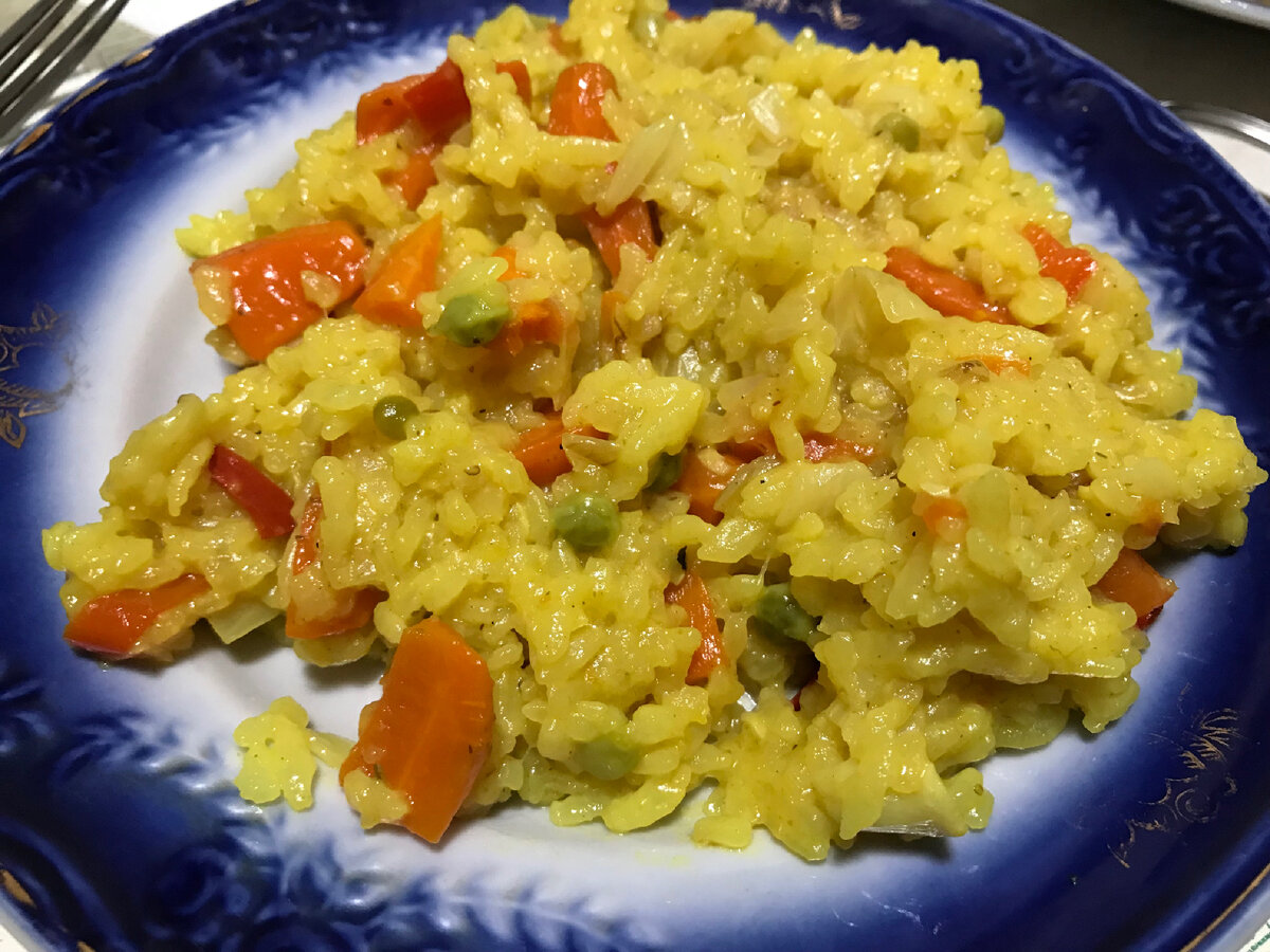 Это прекрасный гарнир, который вполне может быть самостоятельным блюдом. 🔖 Рис - один стакан 🔖 Морковь - 2-3 шт. 🔖 Лук - 2 шт. 🔖 Перец болгарский - 1 шт. 🔖 Горошек зелёный (свежий или замороженный) - 3-4 ст.л. 🔖 Соль, перец, куркума и другие специи по вкусу. 🔖 Жир для жарки. 1️⃣ Лук нарезать на четверть-кольца, морковь - крупно, перец - мелко. 2️⃣ Овощи обжарить в небольшом количестве жира. Добавить куркуму и другие специи. 3️⃣ Промыть рис, высыпать к овощам, перемешать, добавить 2 стакана воды, посолить. 4️⃣ В процессе готовки рис нужно помешивать и добавлять воды, чтобы он приобрёл свою аппетитную консистенцию. 5️⃣ Готов рис будет примерно через полчаса. Примечание: по вкусу можно добавить чеснок на стадии обжарки овощей.
