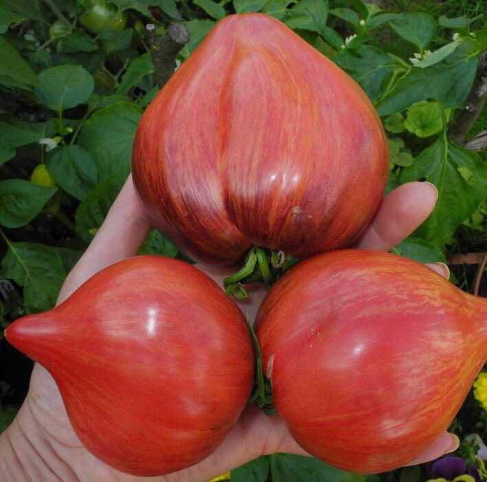 Оригинальное название томат Crushed Heart или Разбитое Сердце, Влюбленное Сердце, Раненое сердце, Подавленное сердце. Название явно связано с любовью. Этот сорт - новинка, разработан Брэдом Гейтсом из США. По сроку созревания сорт среднеспелый, длительного плодоношения, лучше всего показал себя при выращивании в теплице. Куст индетерминантный, высотой 150-180 см. Стебель тонкий, лиановидный, лист пониклый. Лучше вести в 2 стебля, обязательно пасынковать и подвязывать. По форме плоды сердцевидные, на вершине томата носик. Настоящее сердце. Масса плода в среднем 150-200гр. "Разбитое сердце" имеет яркую, расписную окраску. На малиновом фоне жёлтые и оранжевые штрихи и полоски, возле черешка совсем немного антоциана, мякоть розовая. Вкус у томата умеренно сладкий, аромат томатный с пряными нотками. Мякоть маслянистая, мясистая, стенки толстые. Сорт универсального назначения, хоть в салат, хоть для консервации. Плодоносит до самых заморозков. Однозначно-он у меня остаётся. Обязательно буд
