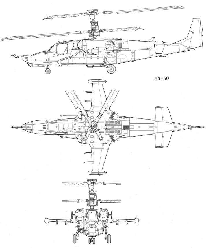 Ка-50 — двухдвигательный одноместный вертолёт с соосным расположением несущих винтов. Вертолёт оснащён прямым крылом относительно большого удлинения и развитым вертикальным и горизонтальным оперением.