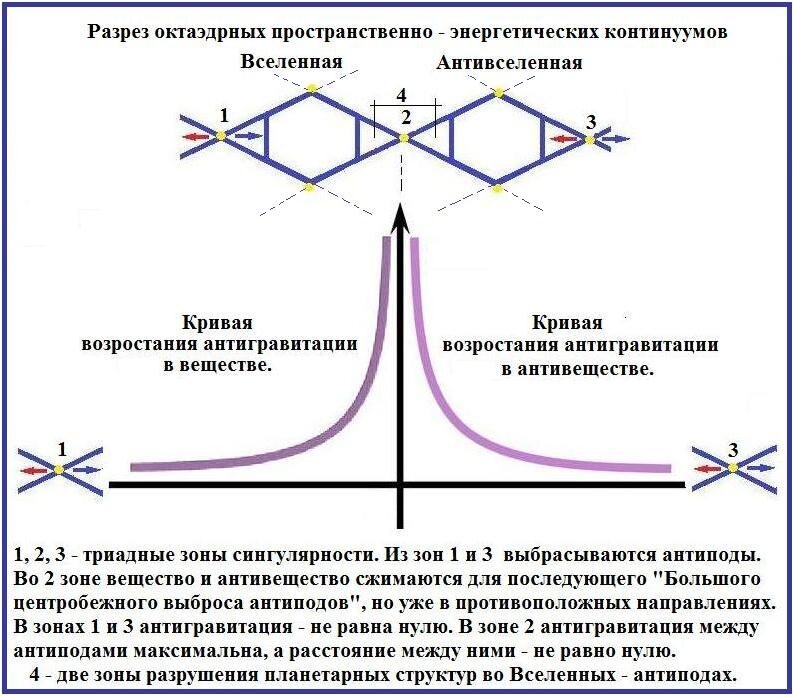 В случае с «Большим взрывом», а точнее с «Большим центробежным выбросом антиподов» сила антигравитации превзошла силы гравитации плюс силы инерции огромных масс вещества и антивещества (летящих навстречу друг другу), и образовала две Вселенных, а точнее два новых цикла, движения антиподов (вещества / антивещества), в их старых энергетических каркасах (сотах).