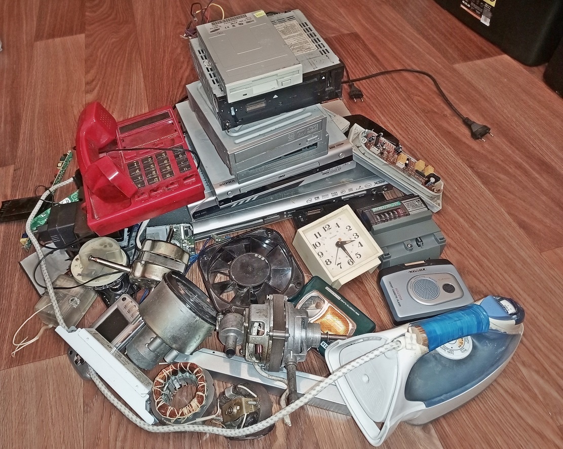Сегодня мы разберём кучу всякого электронного добра и посмотрим, что можно с этого взять и как заработать. Долго копилась коробка со всяким хламом, тут и : DVD плееры, ауди плееры, старый телефон, будильник, смарт приставка, портативная игровая консоль, утюг и много ещё чего. Запасаемся отвёртками, бокорезами, паяльником и массой времени. Времени потребовалось действительно не мало, чтобы это всё разобрать. Я время использовал максимально грамотно, разбирал электронику, а попутно просматривал много полезного контента на ютубе. Получилось очень много чёрного металла, целых 10 кг из мусора. Алюминия - 1,2 кг. Латуни - о,2 кг. Меди - 0,8 кг.