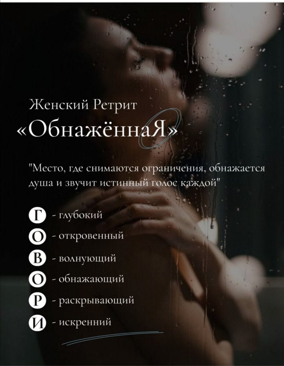 8-11 ДЕКАБРЯ г. Сочи, побережье моря Женский Ретрит "ОбнажённаЯ" 4-х дневное погружение в глубину СебЯ у берега Моря "Место, где снимаются ограничения, обнажается душа и звучит истинный голос каждой" Представь, что в одно утро, ты проснулась в гармонии с собой, ты спокойна, счастлива, в любви и заботе о себе, ты чувствуешь каждую клеточку своего тела, знаешь, как быть и действовать. Ты наполнена энергией и женственностью, сексуальностью и силой. Эти чувства пронизывают тебя и ты уже не понимаешь как может быть по-другому. Это может стать реальностью. Всего за 4 дня на ретрите «ОбнажённаЯ» Женщине важно чувствовать себя. Потеряв однажды своё внутреннее равновесие женская сила и энергия стремительно угасает и начинается упадок во всех сферах жизни, цели становятся недосягаемыми, пропадает мотивация двигаться дальше. Этот ретрит точно для тебя, если ты хочешь: Мы докажем тебе, что зима может быть теплой. Мы будем рядом и вместе пройдем весь путь на котором нас ждут: За дни проведенные в