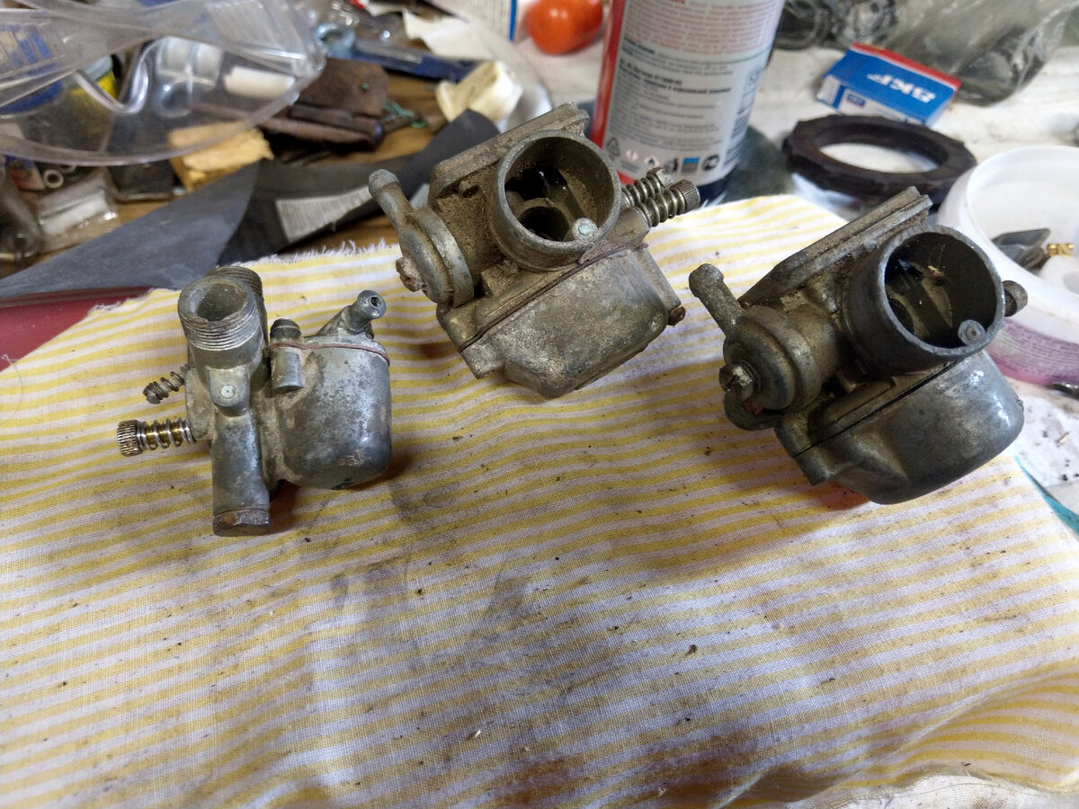 Вообще этот пост задумывался достаточно давно. Но окончательно сформировался, когда я принес от брата мешочек запчастей, включая 3 карбюратора. 2 из которых крактически пустые тушки от к60в. В которых нет ничего ценного, кроме разве что поплавков. А вот третий. К34б. 1968 года выпуска. Вероятнее всего с мопеда типа Рига 5. Но история об этом умалчивает. Был холодный, дождливый день и я решил почистить старый карб, вдруг он мне еще когда-нибудь на что-нибудь сгодится. В целом жизнь была к нему сурова и вместо иглы в него вкручен болт. Что выглядит максимально пригодно к настройке. Благо в ремкомплекте, который был куплен к v50 на синюю ригу были иглы. Которые отлично подходят в этот карбюратор. Настраивается он все равно достаточно специфичным образом. Хотя в интернете довольно много различных инструкций, которые зачастую еще и противоречат друг другу. Мне кажется наиболее разумным самый сложный вариант настройки. Когда на снятом карбюраторе выкручивается жиклер и базовая устано