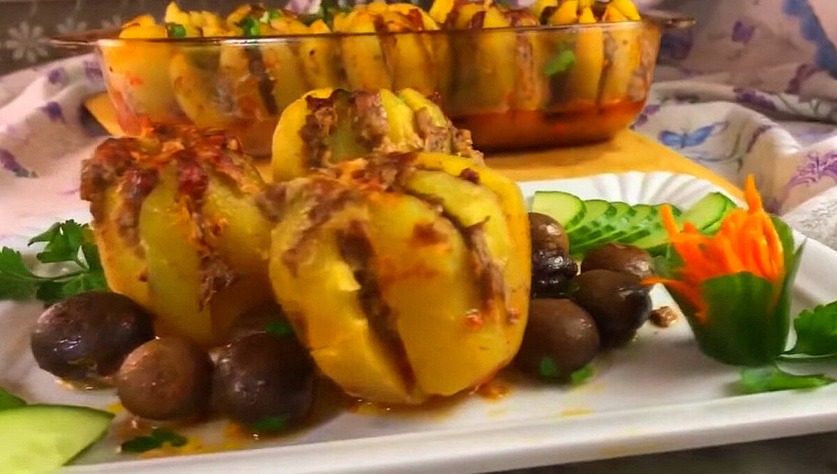 Запечённая картошка с фаршем. Впервые приготовила таким способом и удивилась.