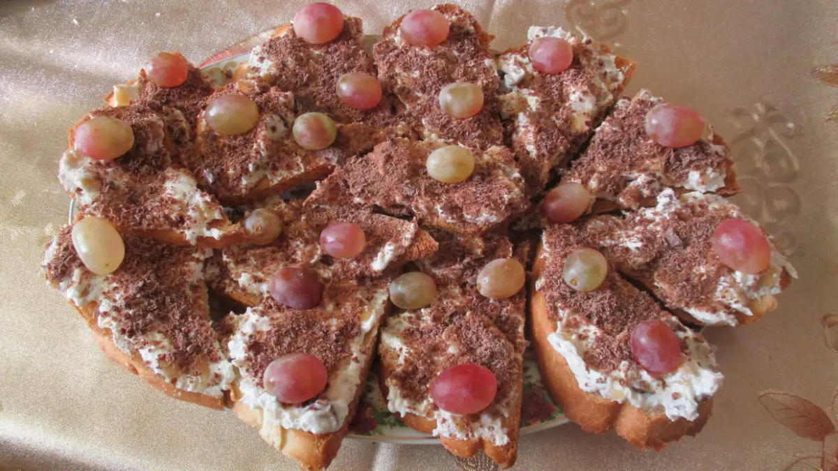 Ингредиенты: батон ванильный-1/2 шт.; творожок-200 г ( приготавливаю сырок сама, рецепт ниже; банан-1 шт.; орех грецкий-150 г ядрышек; сахар- по вкусу; шоколад- 50 г; виноград-по количеству ломтиков батона