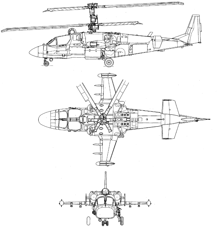 Технические характеристики: Экипаж: 2 (пилот и оператор вооружения) Длина: 16,0 м Длина фюзеляжа: 14,2 м Диаметр несущего винта: 14,5 м Размах крыла: 7,3 м Максимальная ширина фюзеляжа: Высота: 5 м Площадь, ометаемая несущим винтом: База шасси: Колея шасси: Максимальная взлётная масса: 12 200 кг Масса топлива во внутренних баках: 1487 кг (1732 кг в 4 х 500 л ПТБ) Силовая установка: 2 × турбовальных ВК-2500 производства «ОАО "Климов"» Мощность двигателей: 2 × 2400 л. с. (на взлётном режиме) на чрезвычайном режиме: 2 x 2700 л. с. на крейсерском режиме: 2 x 1750 л. с. Лётные характеристики: Максимально допустимая скорость: 350 км/ч Максимальная скорость: 300 км/ч Крейсерская скорость: 260 км/ч Практическая дальность: 460 км Продолжительность полёта: Перегоночная дальность: 1110 км Статический потолок: 4000 м Динамический потолок: 5500 м Скороподъёмность: 15 м/с MCA (H=0) Максимальная эксплуатационная перегрузка: +3,5 g Вооружение: Стрелково-пушечное: 1 × 30-мм пушка 2А42 (боезапас —