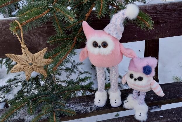 Что запланировала, то и сделала! Вот мои Совушки во всей красе, помните я писала про подобные персонажи вот ЗДЕСЬ! И вот уже две Совы стоят под елочкой между прочим колпачки у них съемные, чтобы можно было образ менять... вот так... Ножки у них деревянные и длинные, все как хотела, вот только вариант со сморщенными носочками мне как-то не очень нравится, мне думается, что я переборщила с присборкой, надо было покороче их делать, А Вам как кажется? Стоят устойчиво, не смотря на рост, а еще ножки можно развернуть в разные позиции, наполняла тельце синтепухом, глазки диаметром 14мм и 18 мм, носик пластиковый, я его покрасила черным акрилом. Размер Совушек получился - большая 30 см, а маленькая 23 см в колпачке)))) В видео я не только показываю как сшить таких Совушек , но и рассказываю из чего они сшиты, а при шитье из этого материала есть свои швейные хитрости, которые я с радостью Вам открою))))) Если понравился мастер класс, то буду рада Вашим лайкам, а также тем, что Вы поделитесь и