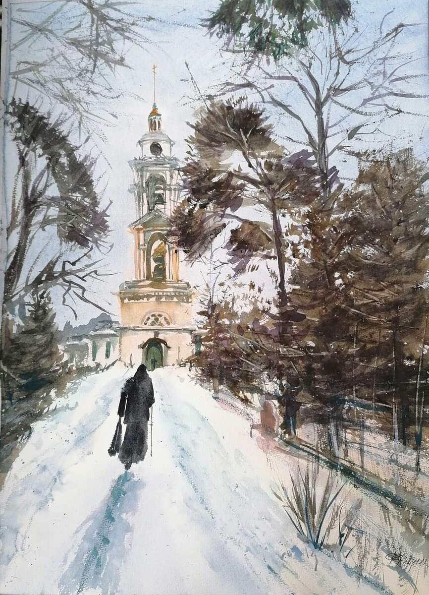 Прошлогодняя акварельная работа. Свободна. Т. Е. Можно приобрести. Размер 54х38. Дорога к храму