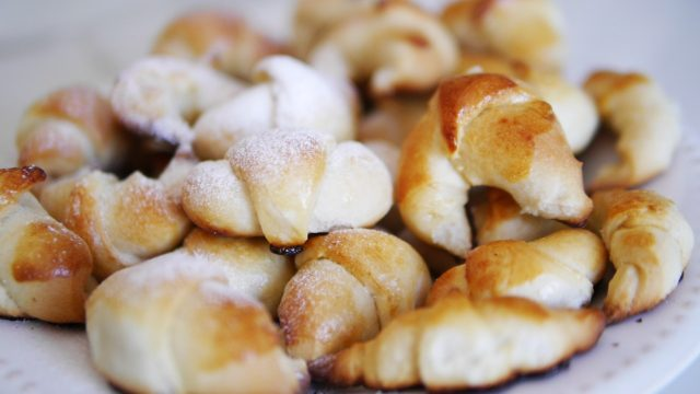 Простой рецепт домашних рогаликов, которые можно приготовить за 3 шага. В результате этого рецепта получаются пышные, очень вкусные рогалики, хоть они и без начинки. Ингредиенты Как приготовить рогалики шаг за шагом. 1- Предварительное брожение: Этот этап предшествует приготовлению теста, он используется для проверки работоспособности дрожжей. В миску налить теплое молоко. Добавить чайную ложку сахара и одну ложку муки. И, наконец, свежие дрожжи. Также подойдут сухие дрожжи (их 15 гр). Все ингредиенты полностью перемешать. Накрыть миску крышкой и оставить на 15 минут, пока не образуется пена. 2- Тесто: В миску большего размера насыпать муку, в середине сделать углубление. Туда положить сахар, яйцо, молоко и столовую ложку подсолнечного масла. Соединить все ингредиенты с мукой от центра наружу. В процессе приготовления теста добавить немного ванилина и немного цедры лимона. И, наконец добавить дрожжевую пену, которую приготовили ранее. Еще раз хорошо перемешать ингредиенты. Собрав все в