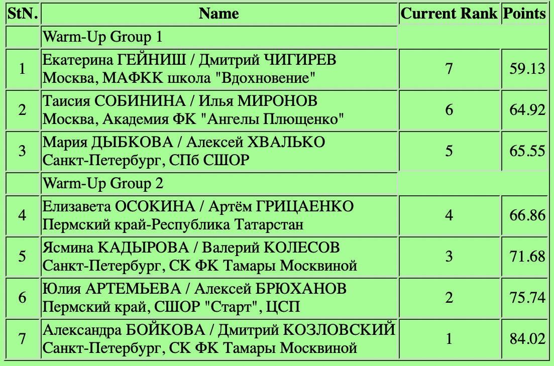 Прокат не без ошибок, но на фоне прошлых двух пар ребята смотрелись выигрышнее и в плане техники, и в плане артистизма, и в скатанности в том числе. И хотя по баллам Гейниш и Чигирёва им обойти не удалось, петербуржцы мне понравились больше. Но ребятам хватило разницы в КП, чтобы эти 4 балла не сказались на конечном результате.