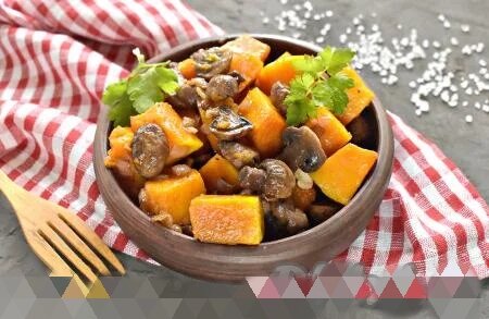 Предлагаю запечь в духовке кусочки тыквы с шампиньонами. Это постное блюдо получается сытным, сочным, ароматным и вкусным. Его можно подать и в качестве основного, и в качестве гарнира. Тыква, запечённая с грибами, отлично впишется в повседневное меню. Всем советую этот простой и удачный рецепт! Ингредиенты Для приготовления тыквы с шампиньонами в духовке потребуется: тыква (очищенная) - 400 г; шампиньоны (я использовала замороженные) - 200 г; лук - 1 шт.; чеснок - 2 зубчика; растительное масло - 3 ст. л.; соль, чёрный молотый перец - по вкусу Процесс приготовления Для этого блюда я взяла замороженные шампиньоны, разморозила их, переложила в дуршлаг и промыла тёплой водой. Если вы готовите со свежими шампиньонами, тогда с них нужно убрать загрязнения и хорошо промыть грибы водой. Тыкву очищаем от семян и кожуры. 400 грамм очищенной тыквы нарезаем на крупные кусочки. Кусочки тыквы перекладываем в жаропрочную форму и сбрызгиваем 1 с