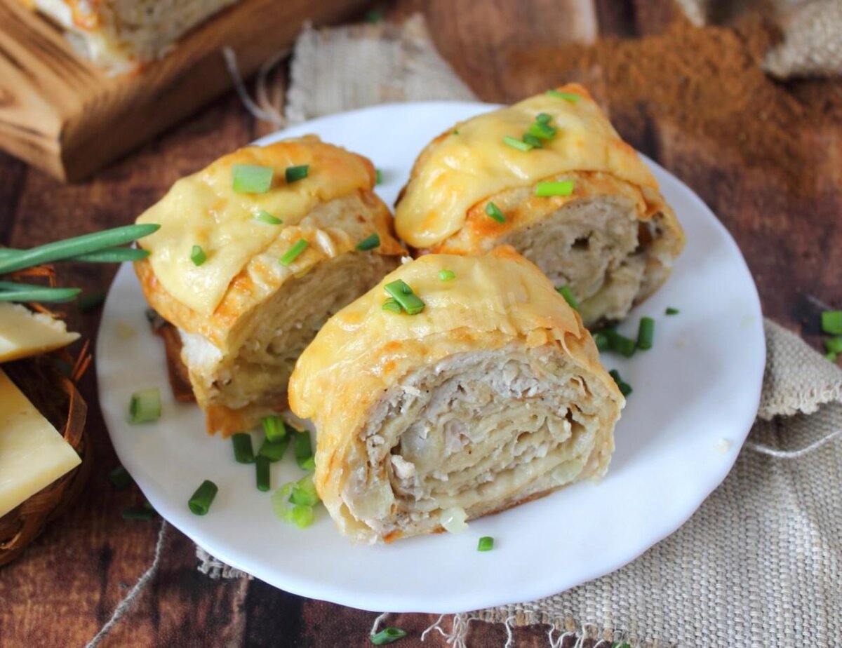 ВАМ ПОТРЕБУЕТСЯ: - 200 грамм куриной грудки, - 160 грамм творожного сыра, - 90 грамм сыра, - 2 помидора, - 2 столовые ложки сливок, - 2 столовые ложки сметаны, - зелень укроп/петрушка, - 1 зубчик чеснока, - соль, перец по вкусу, - 100 грамм лаваша, - 1 желток. СПОСОБ ПРИГОТОВЛЕНИЯ: 1. Грудку отварить, остудить, нарезать на кубики. 2. В миске смешиваем творожный сыр, 50 грамм натертого сыра, сливки. 3. Добавляем рубленную зелень, помидоры, куриную грудку, чеснок, соль, специи. Все перемешиваем. 4. Раскладываем лаваш, смазываем сметаной, выкладываем начинку и сворачиваем в рулет края загнув во внутрь 5. Смазываем желтком и отправляем в разогретую духовку на 20-25 минут на 180 градусов.