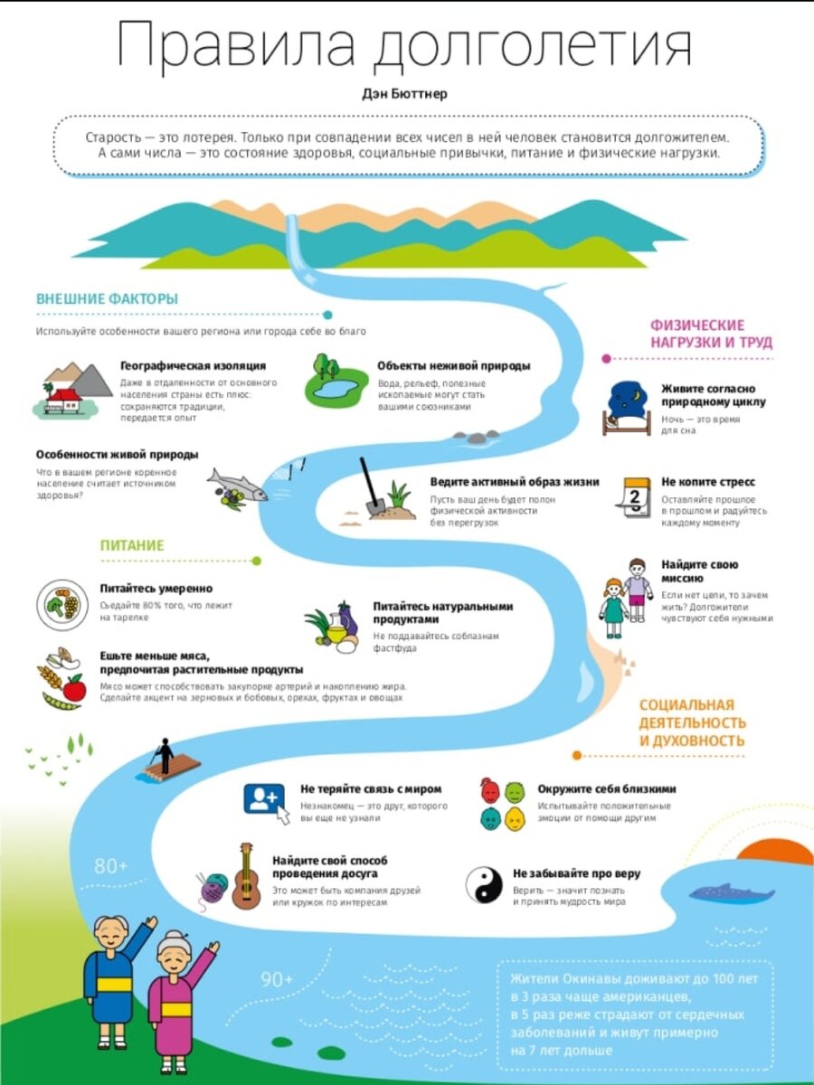 Результаты крупнейшего исследования долгожителей. Девять убедительных и простых правил долголетия Дэн Бюттнер собирал по всему миру. Результаты крупнейшего исследования долгожителей ученый получил, общаясь со стариками в четырех географических «голубых зонах» — Никоя (Коста-Рика), Лома-Линда (США), Сардиния (Италия) и Окинава (Япония). Средняя продолжительность жизни в этих районах — 80 лет, при этом старики выглядят моложе и чувствуют себя лучше, чем в других частях планеты. Изучаем, делаем)