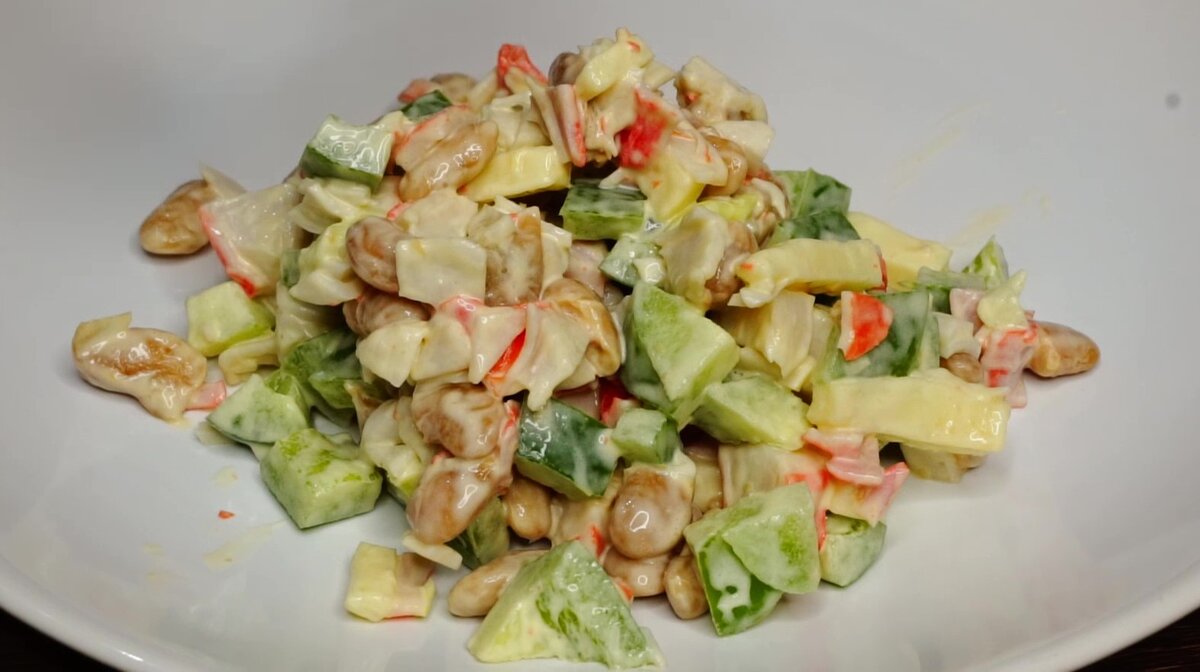 Ингредиенты: Крабовые палочки - 200 гр. Фасоль - 1 банка маленькая. Перец болгарский - 1 шт. крупный. Сыр "Брынза" - 100 гр. Майонез - 3 ст.л. Приготовление: Крабовые палочки или крабовое мясо нарезаем крупно. Болгарский перец нарезаем на кубики 0,5*0,5 см. Для этого рецепта лучше выбрать перец зеленого цвета и большого размера. Сыр "Брынза" нарезаем на тоненькие полосочки. Добавляем консервированную фасоль любого цвета. Зубчик чеснока натереть на мелкой тёрке. Добавляем майонез. Соль, перец по вкусу. Украшаем салат свежей зеленью, мелко нарезаем. Салат готов! Приятного аппетита! Ссылка на видео рецепт: Ещё видео рецепт салата к празднику: