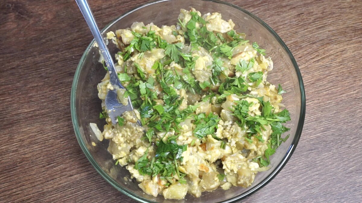 Кориандр - 0,5 ч.л. Приготовление: Очищаем баклажаны. Режем баклажаны мелко на кубики 0,5*0,5 см. Лук режим мелко. Разогреваем сковороду. Наливаем подсолнечное масло. Обжариваем лук. На другой сковороде на подсолнечном масле обжариваем баклажаны, солим. Добавляем кориандр. Добавляем яйца к баклажанам и быстро смешиваем. К баклажанам добавляем жареный лук. Накрываем баклажаны крышкой и тушим 7 минут. Режем мелко петрушку и посыпаем баклажаны. Приятного аппетита! Ссылка на видео рецепт: