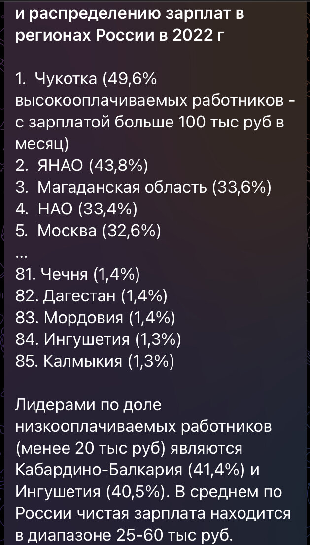 Зачем вообще устраивают опросы? Узнать общественное мнение и как оно соотносится с мнением власти. Тем более мир меняется так стремительно, что стандарты не успевают за реальной жизнью... /Из комментария GEES.../ Утром в Телеграмм-канале РИА Новости наткнулся на рейтинг по уровню... Такие вот зарплаты в России. Севера и Москва рулит в зарплатных рейтингах. Даже Питер не вошёл в пятёрку призёров! Интересно, Чечня и некоторые другие кавказские республики почти всегда последние в зарплатных рейтингах России. Вот только за какие деньги они строят у себя дома, больше похожие на особняки? Мне же вспомнился мой недавний опрос о зарплатах работающих пенсионеров. Напомню, что согласно данных Росстата, средняя зарплата работающих пенсионеров возрастом 60+ для мужчин: 50 000 рублей, а для женщин чуток более 40 000. Вот о зарплате я и спросил у читателей. В опросе поучаствовало уже 2 135 человек. Смотрите ниже, что получилось. МОЯ ЕЖЕМЕСЯЧНАЯ ЗАРПЛАТА РАБОТАЮЩЕГО ПЕНСИОНЕРА НА ПОЛНУЮ СТАВКУ СОСТА