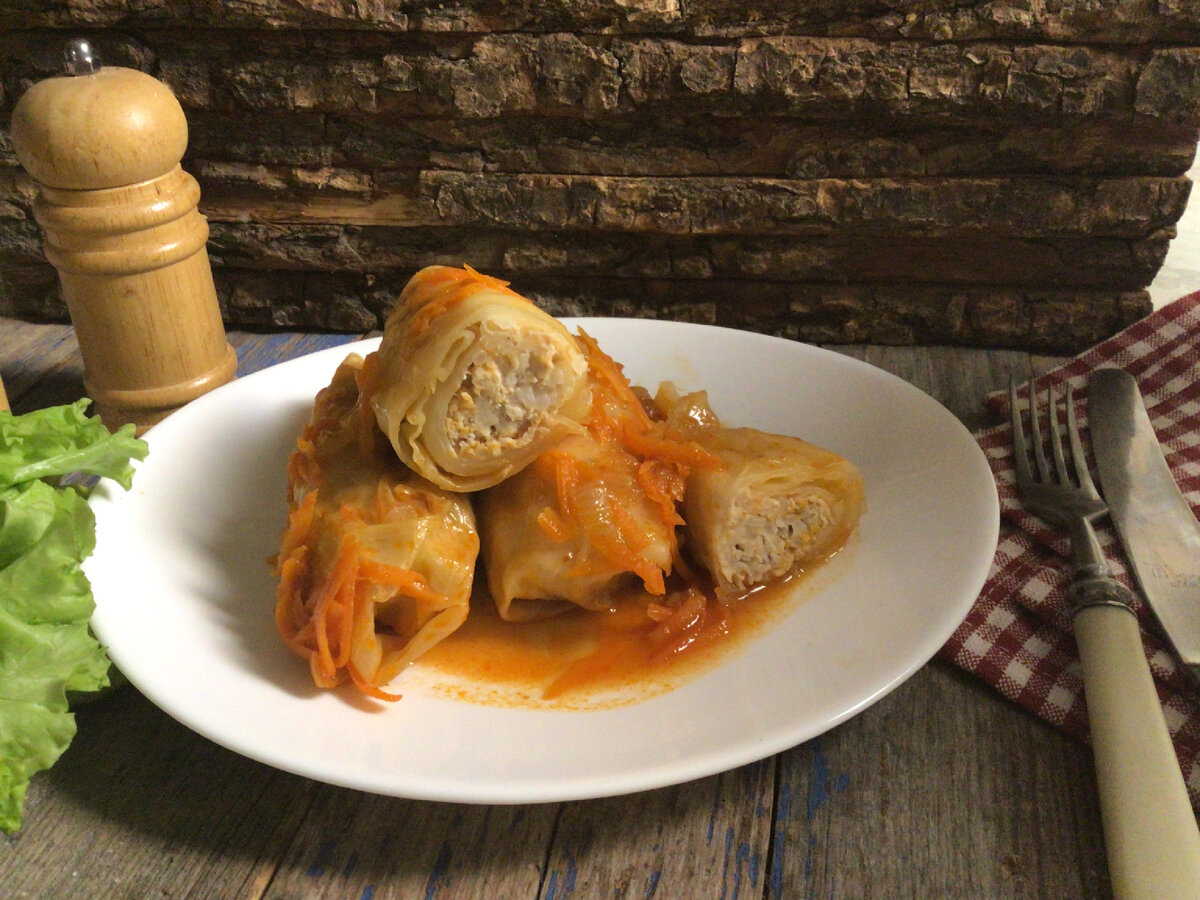 Здравствуйте, дорогие подписчики и гости моего канала. Сегодня буду готовить голубцы, ни какие нибудь фильдеперсовые, а обычные по классическому рецепту, но обязательно обжаривать. Спросите, зачем это делать? Отвечу по ходу приготовления . Готовим начинку для голубцов. Заранее приготовим фарш и специи. У меня сегодня фарш из свиного мяса. Замачиваем в кипятке рис на 15 минут. Кто-то рис заранее отваривает. Считаю, что делать этого не следует. Иначе во время приготовления голубцов рис превратится в кашу. Все ингредиенты смешиваем. Начинка готова. Приготовим заливку. Морковь натираем на крупной тёрке. Лук нарезаем мелко. Сначала на сковородке с добавлением растительного масла пассируем лук до золотистого цвета. Затем добавляем морковь и обжариваем до мягкого состояния моркови. Как только морковь станет мягкой добавляем томатную пасту, перемешиваем и обжариваем всё 2-3 минуты. Затем добавляем воду от варёной капусты и тушим -5 минут. Обязательно надо посолить и добавить специи.