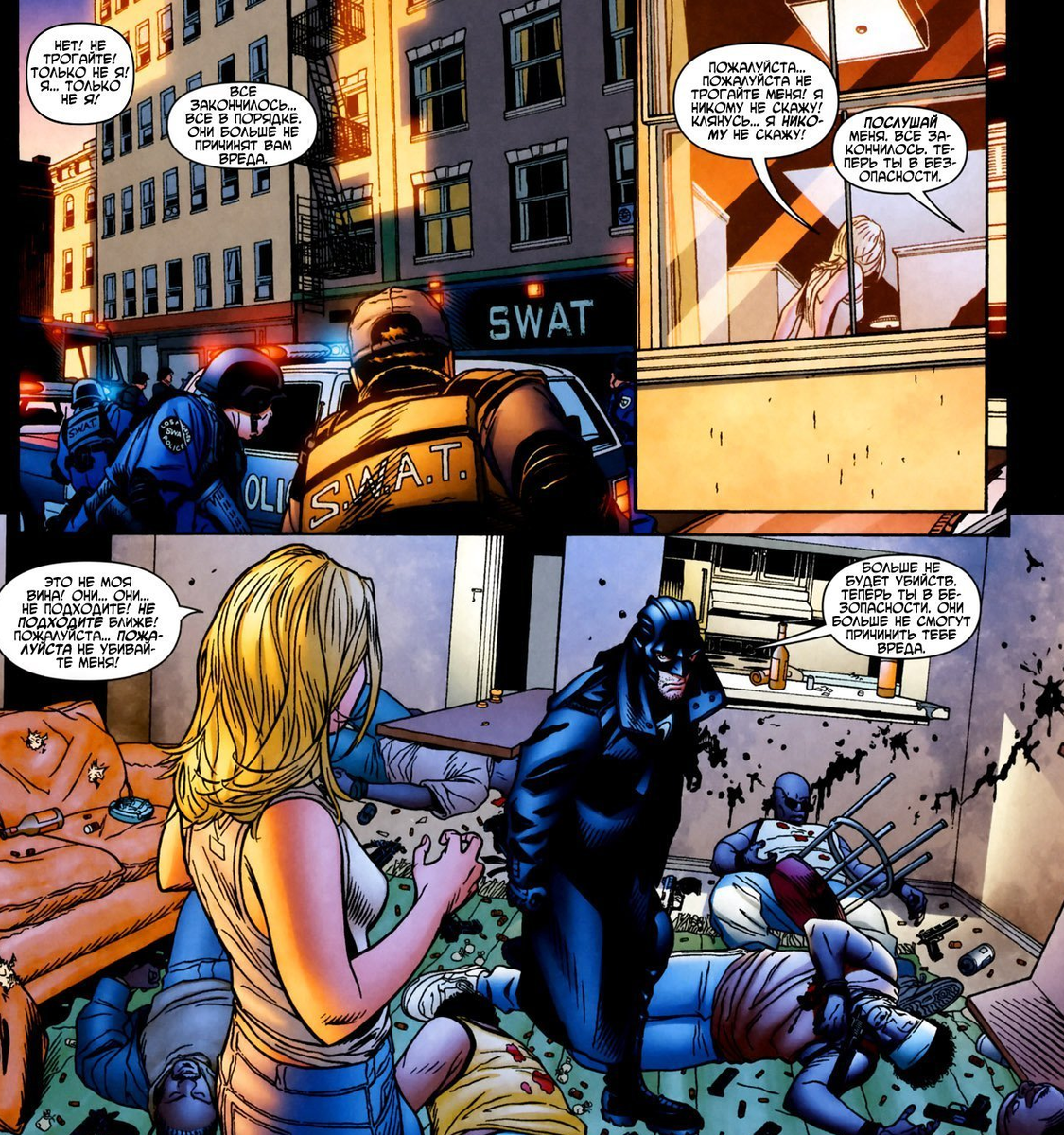 Приветствую всех любителей комиксов с Вами канал Comics_kibets. Предыдущая часть Полицейские окружили здание. Внутри Миднайтер уже убил несколько парней и пытается успокоить девушку, которая до смерти напугана и думает, что ее тоже убьют. Не веря Миднайтеру, она выпрыгивает из окна и разбивается. Приходит главный коп, успокаивая Миднайтера, и тот уходит. На крыше он снимает маску и вспоминает последнюю фразу, которую девушка ему сказала: «ты убил бога». Спустя время Миднайтер оказывается в квартире и разговаривает с удочеренной дочерью – Дженнифер. Она передает ему диск с данными, в котором содержится вся информация о его прежней жизни до Бендикса. В городе Гармония происходят странные вещи. Некоторые люди носят маски с флагом Америки вместо лица и ведут себя подозрительно. Миднайтер перемещается к знакомому программисту – Честеру. Честер пытается восстановить данные и познакомить Найтера с его прошлой «жизнью». Спустя время восстановление данных завершилось. Миднайтер рассказывает, ч