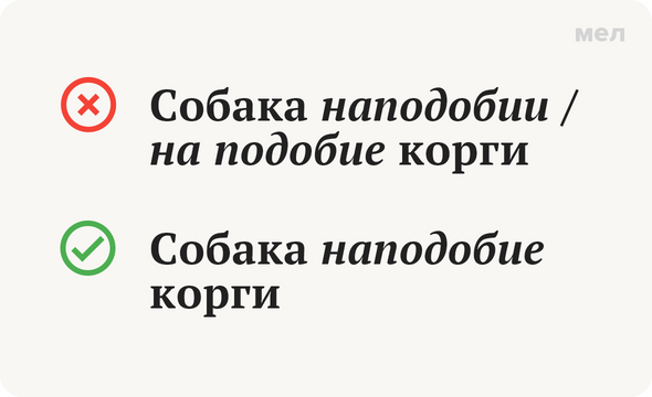 Что такое производные предлоги, почему они означают не совсем то, что кажется, и как научиться отличать их от существительных с предлогом. Правильно: собака наподобие корги «Наподобие» — это производный предлог, образованный от существительного, со значением «в виде», «вроде», «словно». Это бывшая самостоятельная часть речи, которая утратила изначальное значение (и самостоятельность). Другие примеры таких предлогов: «насчет», «ввиду», «вследствие», — и ни про какие «счета», «виды» или «следствия» тут, конечно, речи не идет. То же самое касается и «подобия» в случае с «наподобие». «Наподобие» — неизменяемый предлог, который пишется только так: слитно, с «е» на конце. Как отличить его от «на подобие» и «на подобии», то есть от существительного с предлогом? По смыслу. К примеру, «он весь вечер просидел на подобии скамейки» значит «сидел на чем-то напоминающем скамейку»; «на подобие двух научных работ можно не обращать внимания» значит, что можно закрыть глаза на сходство двух научных труд
