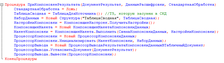 Если для формирования отчета используются данные, которые невозможно получить запросом, можно использовать "набор данных - объект" 1) В модуле отчета инициируем предопределенную процедуру "ПриКомпоновкеРезультата" и вставляем в нее следующий код: Процедура ПриКомпоновкеРезультата(ДокументРезультат, ДанныеРасшифровки, СтандартнаяОбработка) СтандартнаяОбработка = Ложь; ТаблицаСводная = ТаблицаДляИсточника(); //ТЗ, которую засунем в СКД НаборДанных = Новый Структура("ТаблицаСводная", ТаблицаСводная); НастройкиКомпоновки = КомпоновщикНастроек.ПолучитьНастройки(); КомпоновщикМакета = Новый КомпоновщикМакетаКомпоновкиДанных; МакетКомпоновки = КомпоновщикМакета.Выполнить(СхемаКомпоновкиДанных, НастройкиКомпоновки, ДанныеРасшифровки);