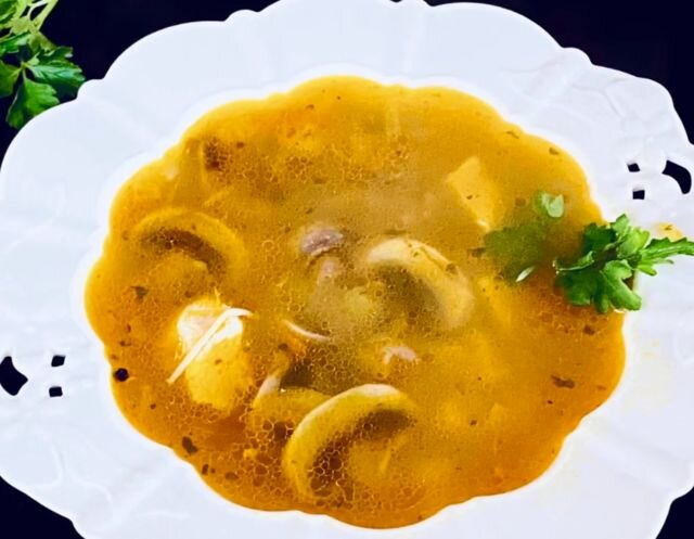 Я очень большой любитель блюд, в котором присутствуют грибы. Уверенна, что и среди моих дорогих читателей таких людей не мало. Обязательно попробуйте приготовить суп таким образом, как описано в данном рецепте. Я думаю, вы будете в восторге. Ингредиенты: Способ приготовления: Курицу опустите в холодную воду и варите до закипания. Когда бульон будет готов, достаньте мясо и нарежьте небольшими кусочками. Репчатый лук нашинковать кубиком и обжарить на сковороде с растительным маслом. Пока он обжаривается натрите на крупной терке морковь. Когда лук приобретет золотистый цвет, добавьте к нему морковь. Шампиньоны порежьте пластиками и тоже добавьте в сковороду. Обжариваем 5 минут. Бульон снова доводим до кипения, бросаем в него мясные кусочки. Картофель чистим и режем кубиком, опускаем в кипящий бульон. Снова доводим до кипения и добавляем зажарку. Вновь ждем закипания, после чего солим и перчим по вкусу и кладем вермишель. Когда вермишель будет готова можно снять кастрюлю с огня. Вкусный, г