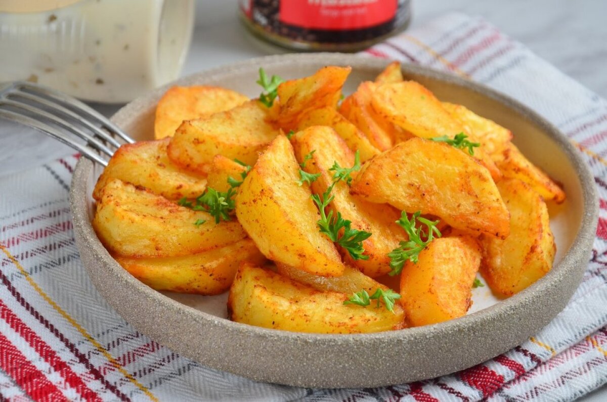 Ингредиенты Пошаговый рецепт приготовления Картофель очистите от кожуры и нарежьте дольками. Смешайте картошку, паприку, соль, молотый перец и растительное масло. Выложите картошку на противень, застеленный фольгой, и запекайте 25 минут в духовке при температуре 200 градусов. В зависимости от размера кусочков время может немного меняться.